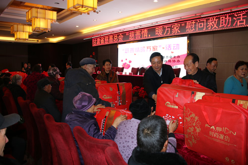 2016年12月12日,甘肅省慈善總會、武威市民政局?jǐn)y甘肅國芳工貿(mào)(集團(tuán))股份有限公司共同舉行“情暖萬家”送溫暖活動,將100萬元資金以及價值100萬元的過冬棉服帶給天?h岔口驛敬老院的老人們。當(dāng)日下午,甘肅省慈善總會與甘肅國芳工貿(mào)(集團(tuán))股份有限公司的各位愛心人士又馬不停蹄的趕赴張掖為當(dāng)?shù)氐墓鹿牙先藥チ?60萬元資金以及價值250余萬元的過冬衣物及被褥。此次活動傳導(dǎo)社會幫扶、精準(zhǔn)扶貧精神的同時也默默為社會傳導(dǎo)著一份正能量。